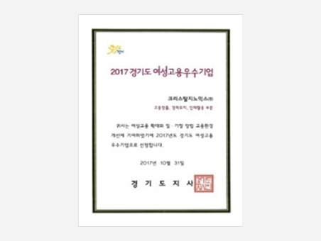 Award for Excellent Enterprise for Female Employment from Gyeonggi ProvinceGovernor of Gyeonggi Province
